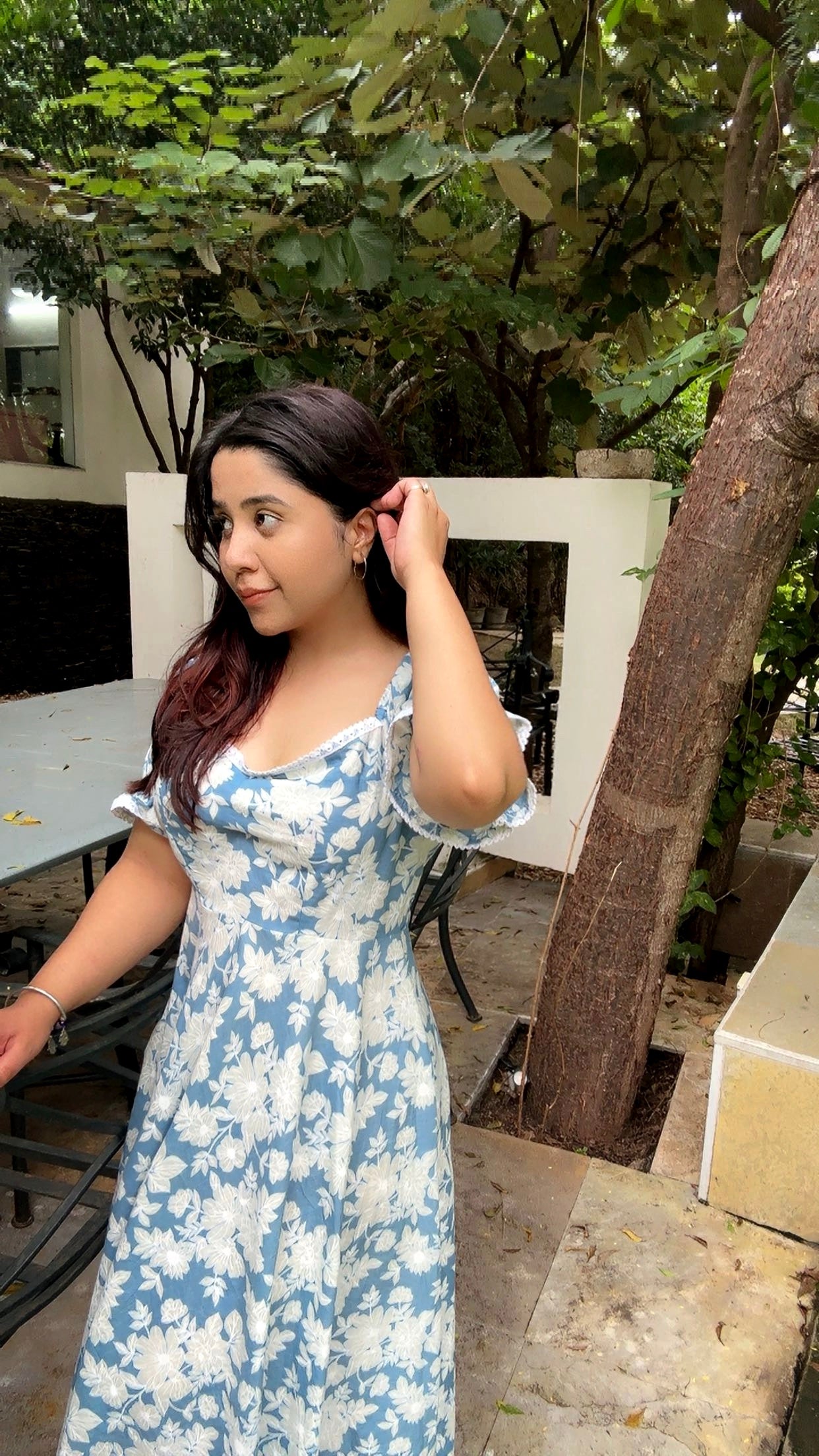 The Amelia Dress is all about effortless grace and timeless femininity. Crafted in soft, breathable cotton, this powder-blue midi dress is adorned with delicate white florals that exude cottagecore charm.