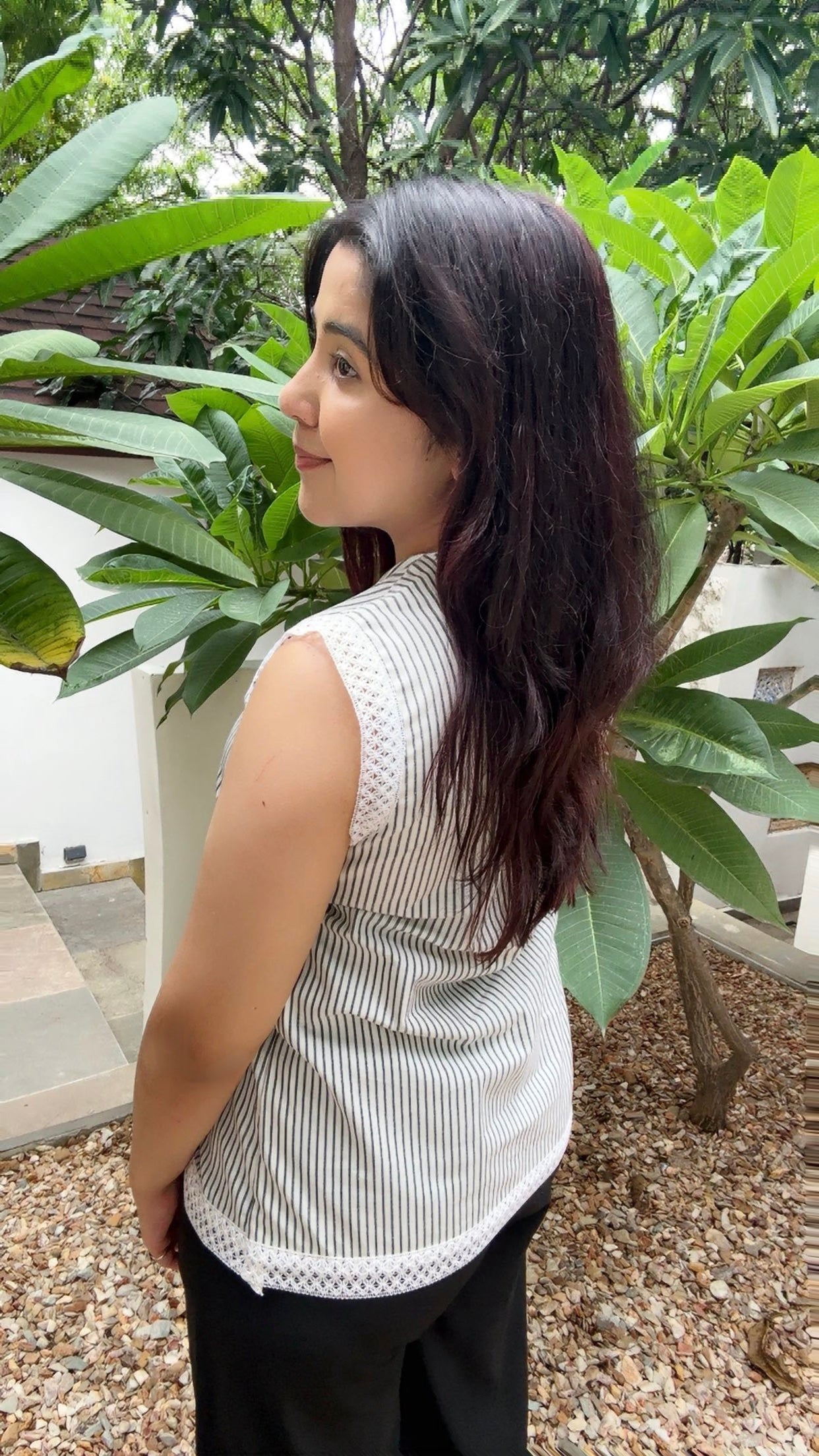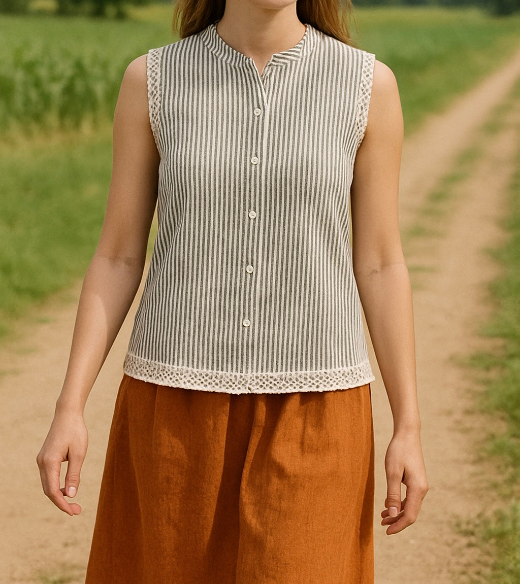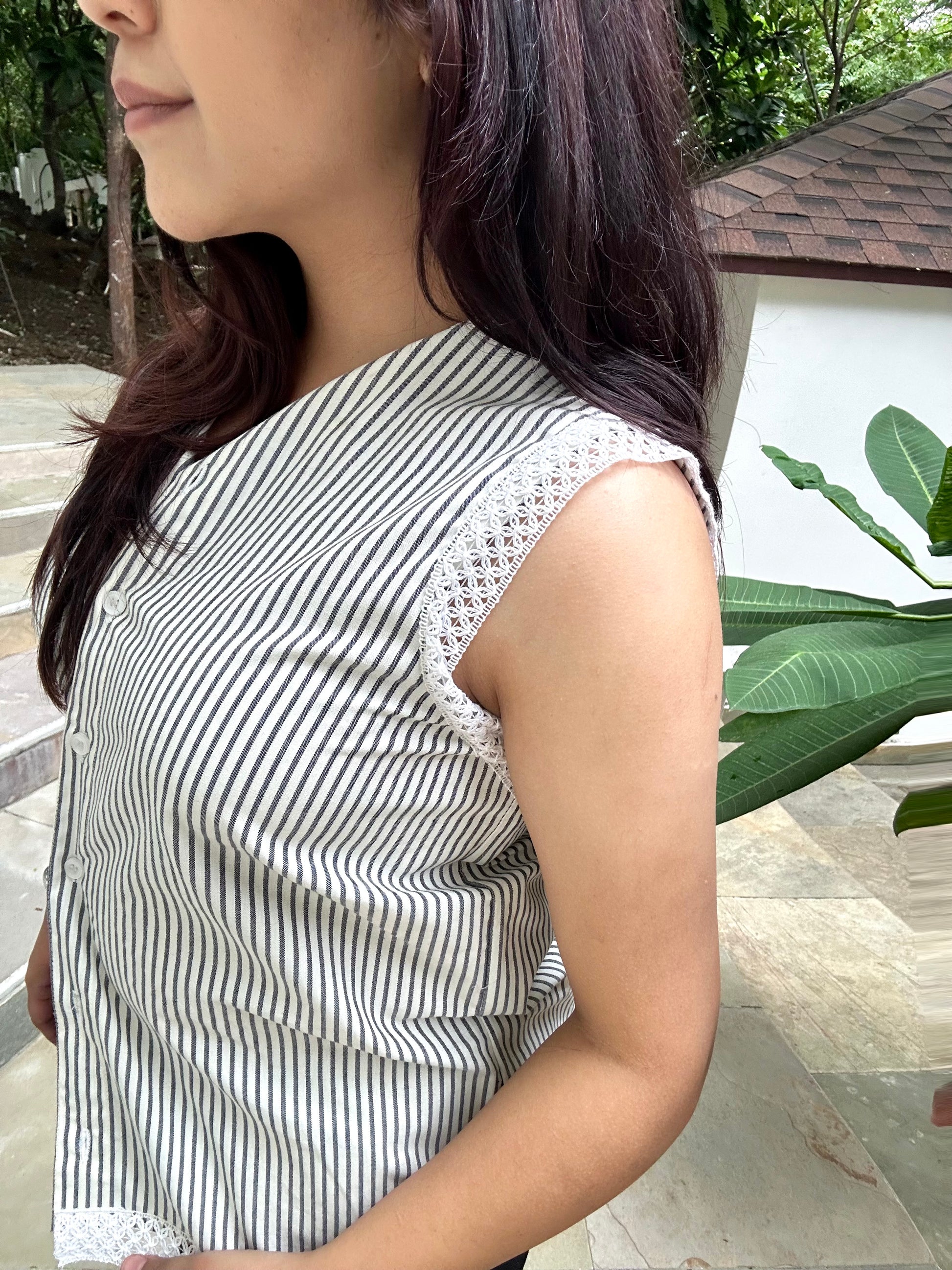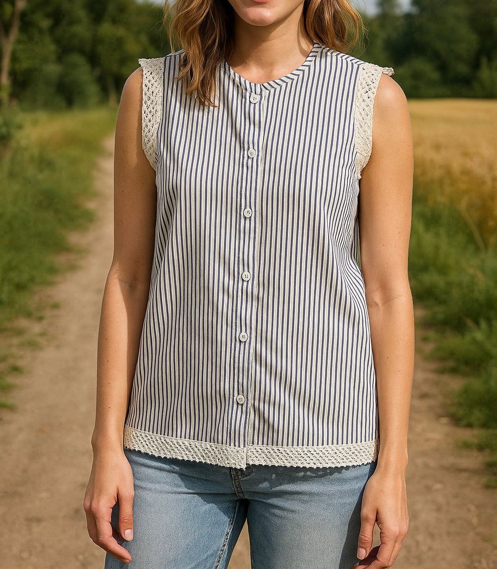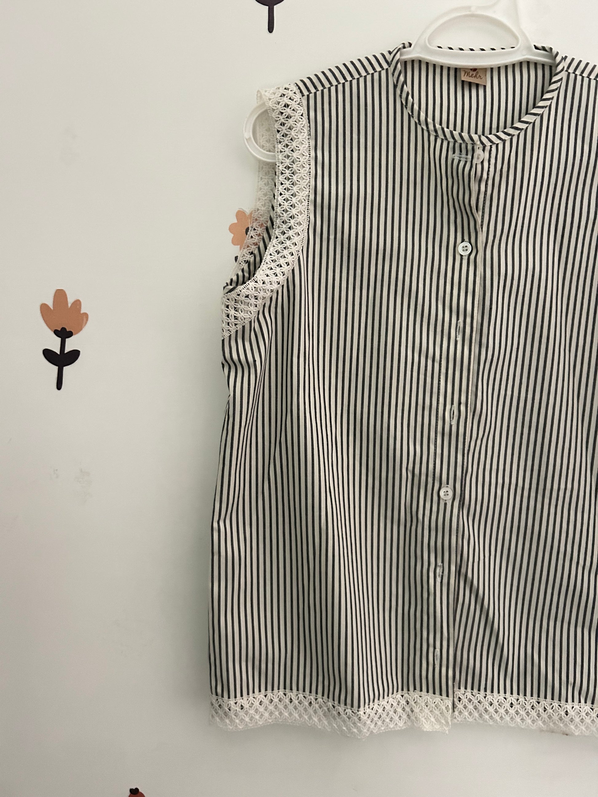 The Clara Top blends everyday ease with delicate detailing. Designed in crisp black-and-white stripes, it features sleeveless shoulders with lace trim and matching lace at the hem for a soft, feminine finish. Lightweight and versatile, this piece pairs effortlessly with jeans, trousers, or skirts, making it a timeless wardrobe staple.