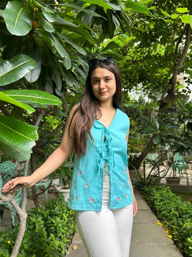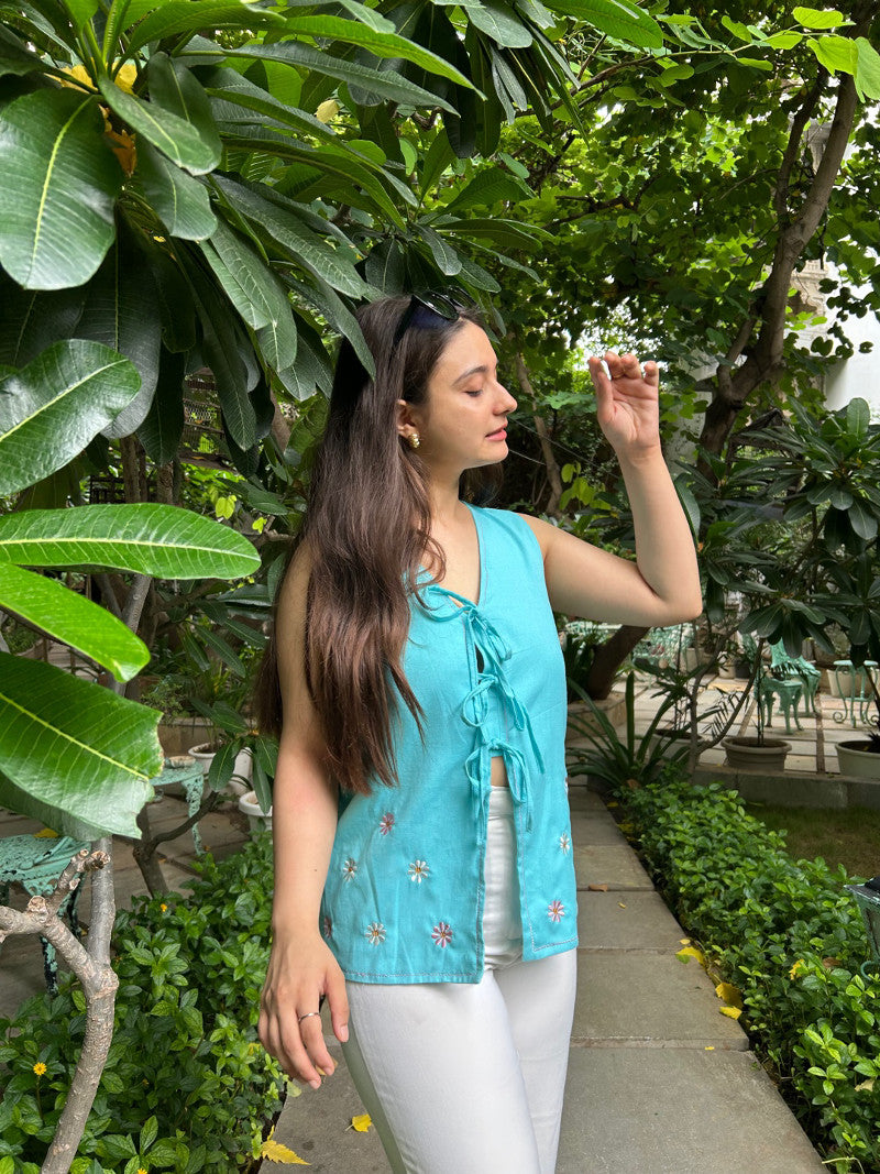 The Daisy Vest is a breezy, boho-inspired layering piece made from a cotton-linen blend. In a refreshing teal shade, this sleeveless vest adds a pop of colour to your outfit. Style it over a kurti, a plain top or even wear it solo with high-waisted bottoms for a modern twist.
