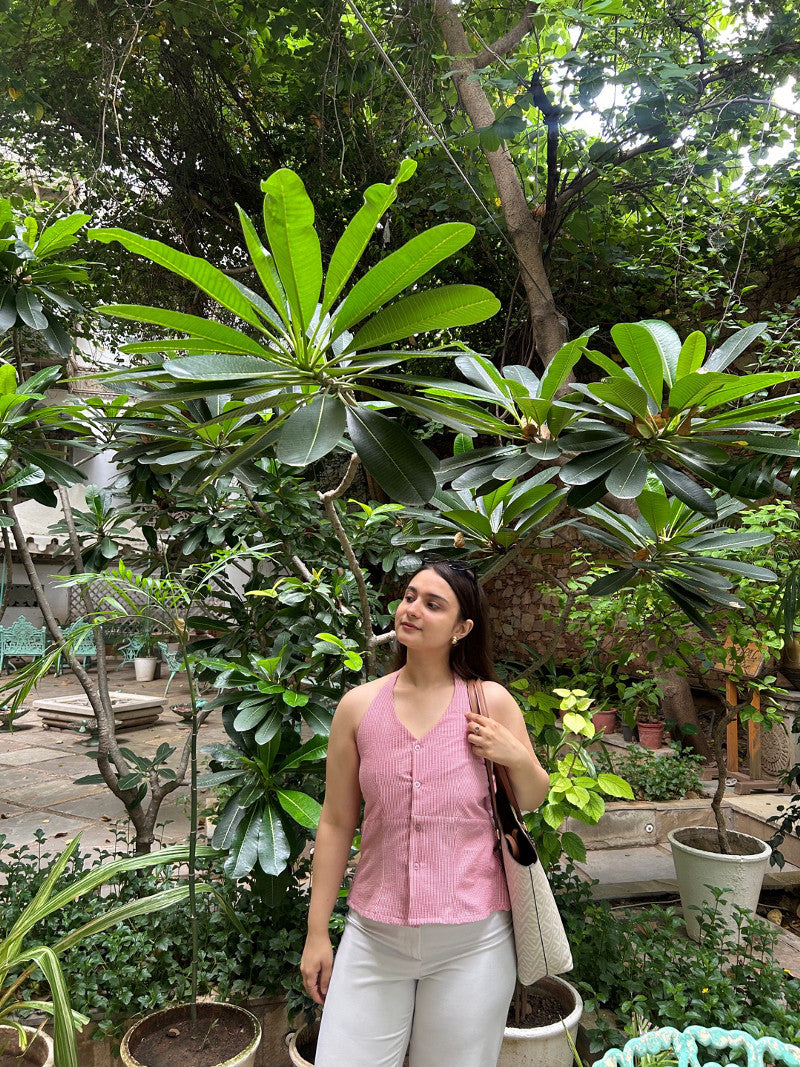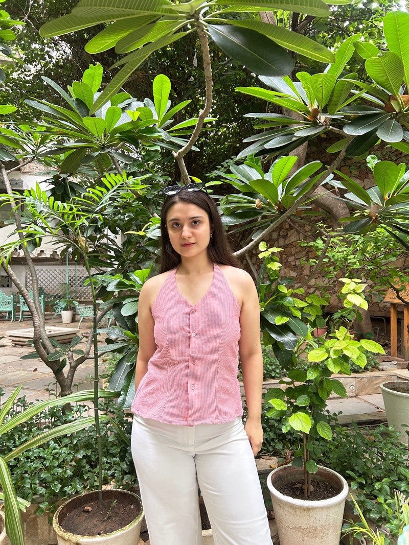 Fresh, playful and perfect for warm days, the Ellara Top is a trendy top for women designed in cheerful pink and white stripes with a flattering halter neckline. Made from soft, stretchable cotton, it feels light on the skin and moves with you. Whether you’re lounging in the park, browsing weekend markets or heading out for coffee, this cotton top for women adds a touch of carefree charm to your look. Pair it with denim shorts for casual ease or wide-leg trousers for a chic vibe.