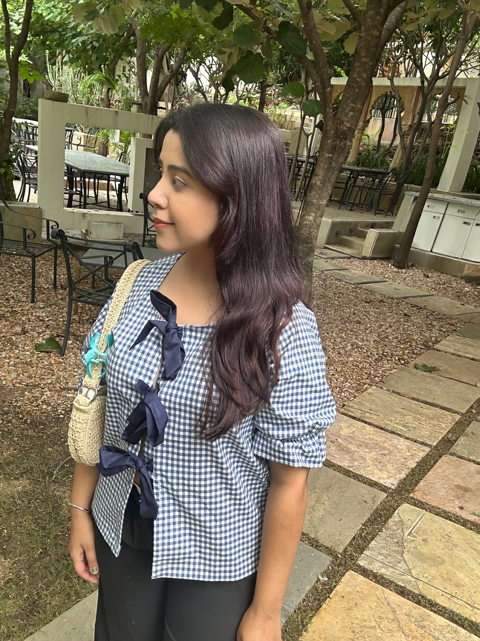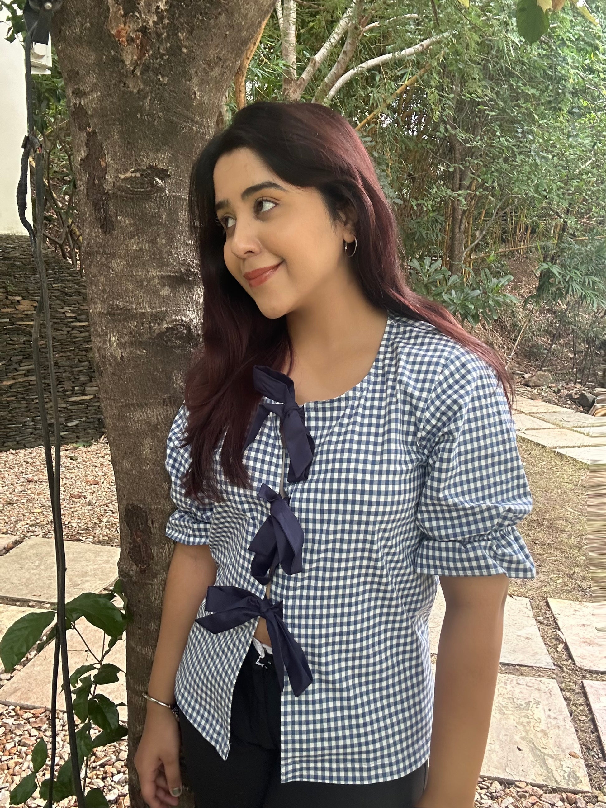 The Hazel Knot Top is a fresh take on everyday chic. Designed in classic blue gingham, it features a flattering fit with front tie-up knot detailing that adds a playful, feminine edge. Crafted in breathable cotton, this versatile piece is perfect for brunches, picnics, or casual outings.