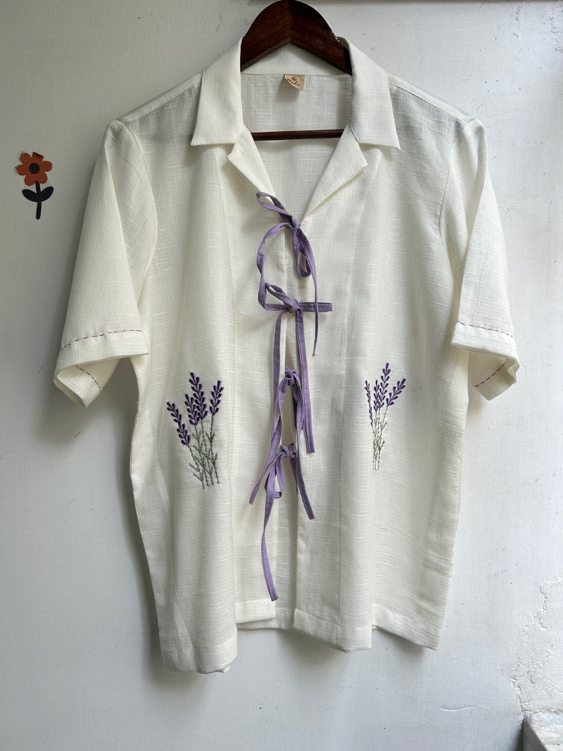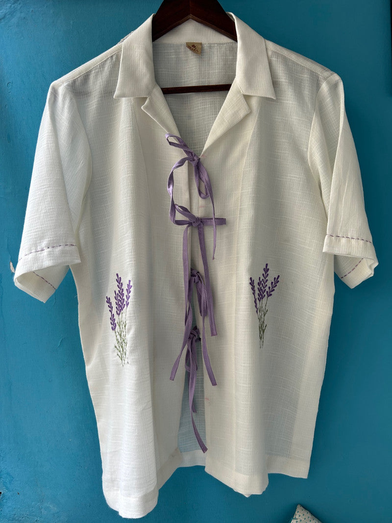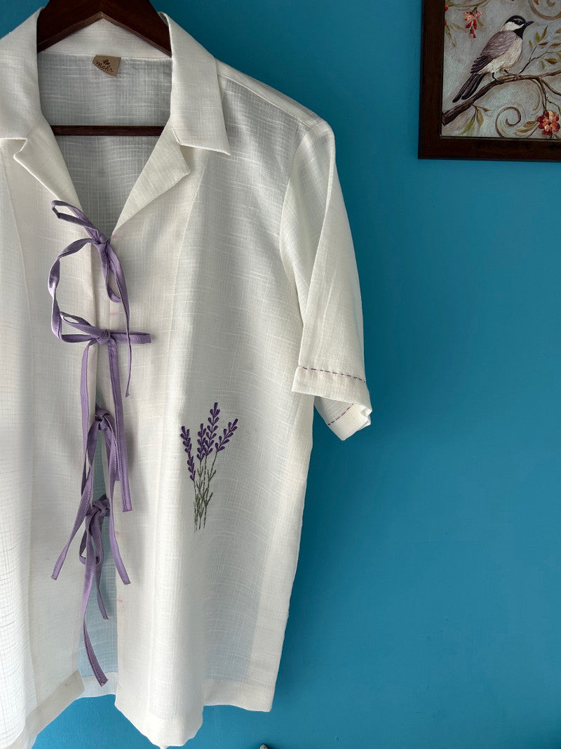 The top features a sophisticated collar and a unique, adjustable lace-up front with delicate lavender ribbons, allowing you to customize your look. Adorned with exquisite hand-embroidered lavender sprigs on the chest, this top adds a touch of whimsical and romantic charm. The thoughtful purple stitching detail on the sleeves and hemline completes the polished and cohesive design.