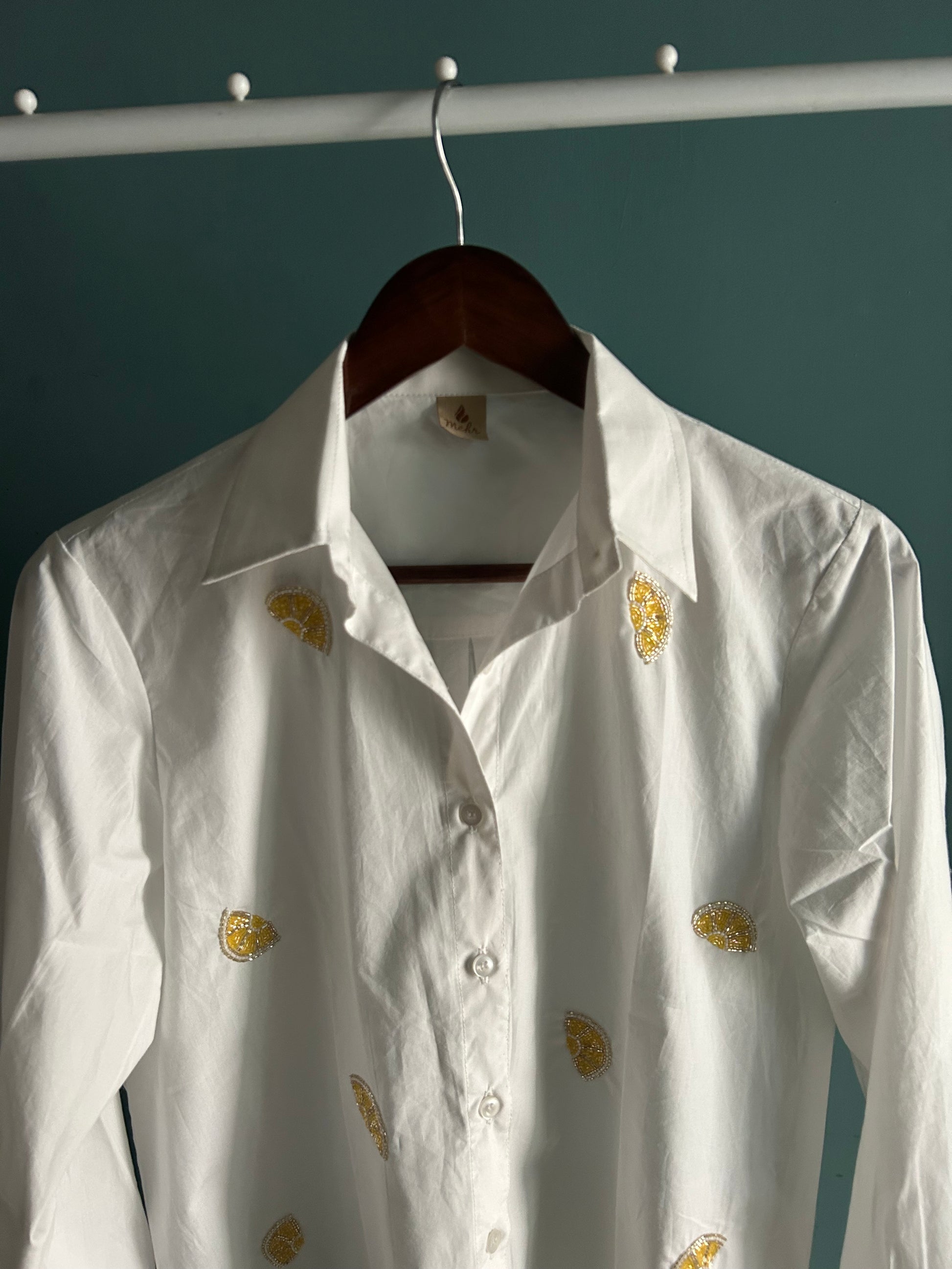 Bring the effortless elegance of a Mediterranean summer to your everyday wardrobe with the Lemon Grove Shirt. This crisp, white button-down is a celebration of craftsmanship, featuring vibrant, hand-beaded lemon slices that twinkle with every movement. A true statement piece, it offers a fresh, spirited twist on classic apparel. Pair it with denim for a chic weekend look or wear it under a blazer for a unique pop of color. The Lemon Grove Shirt is more than just clothingβit's wearable joy for your closet.