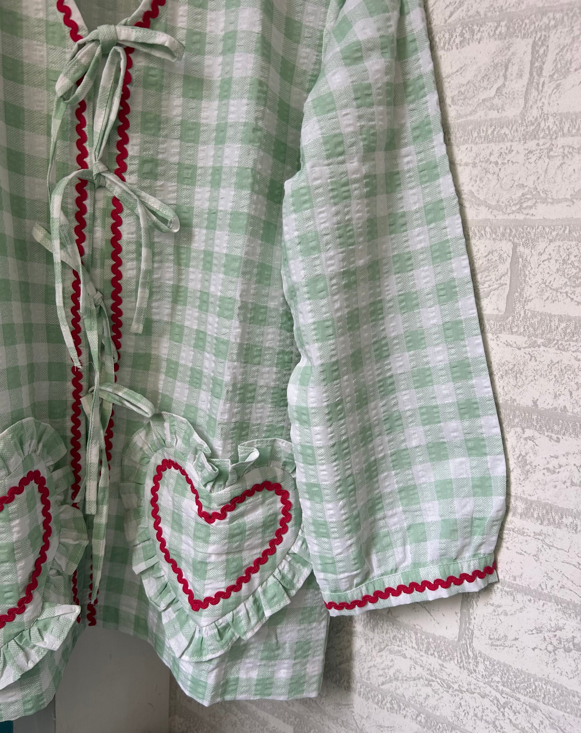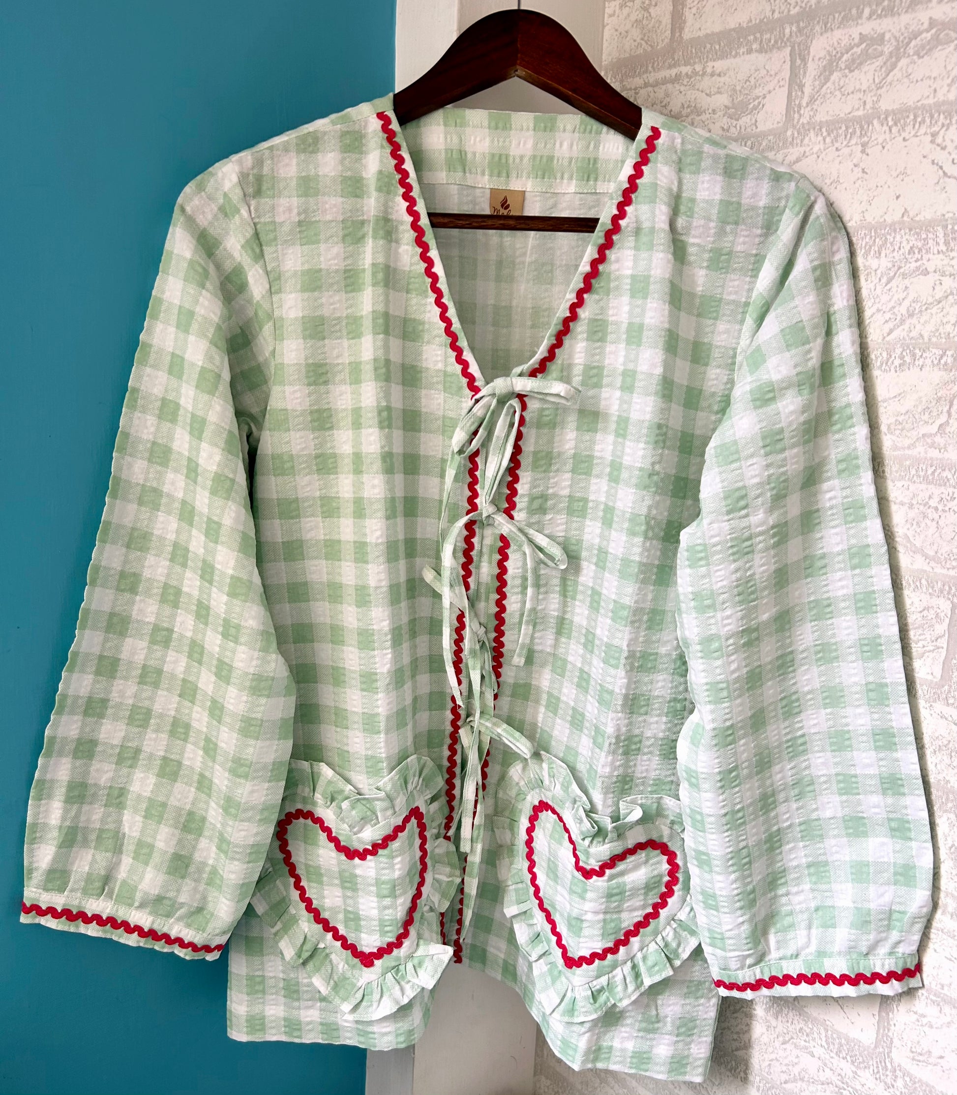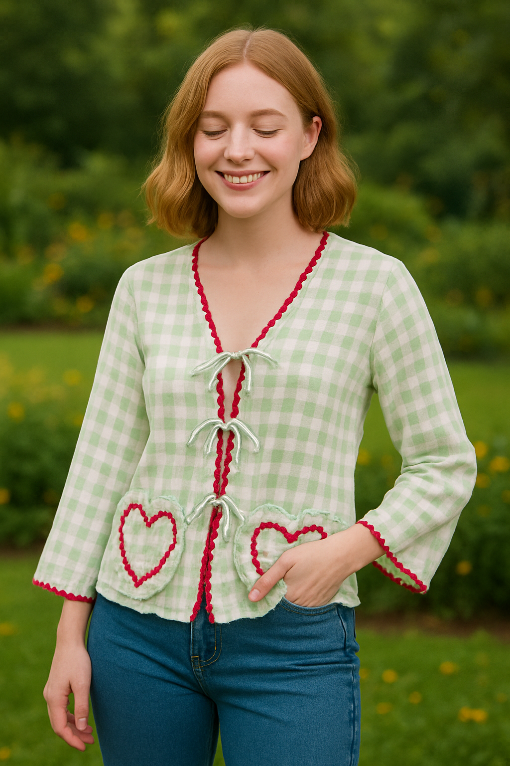 Fall in love with Mint Affair ā a mint green gingham top with hand-crafted heart pockets, ruffle detailing, and bold red trims. This romantic yet playful piece brings together cottagecore charm and everyday comfort. Perfect for brunch dates, cozy picnics, or styling with your favorite denims.