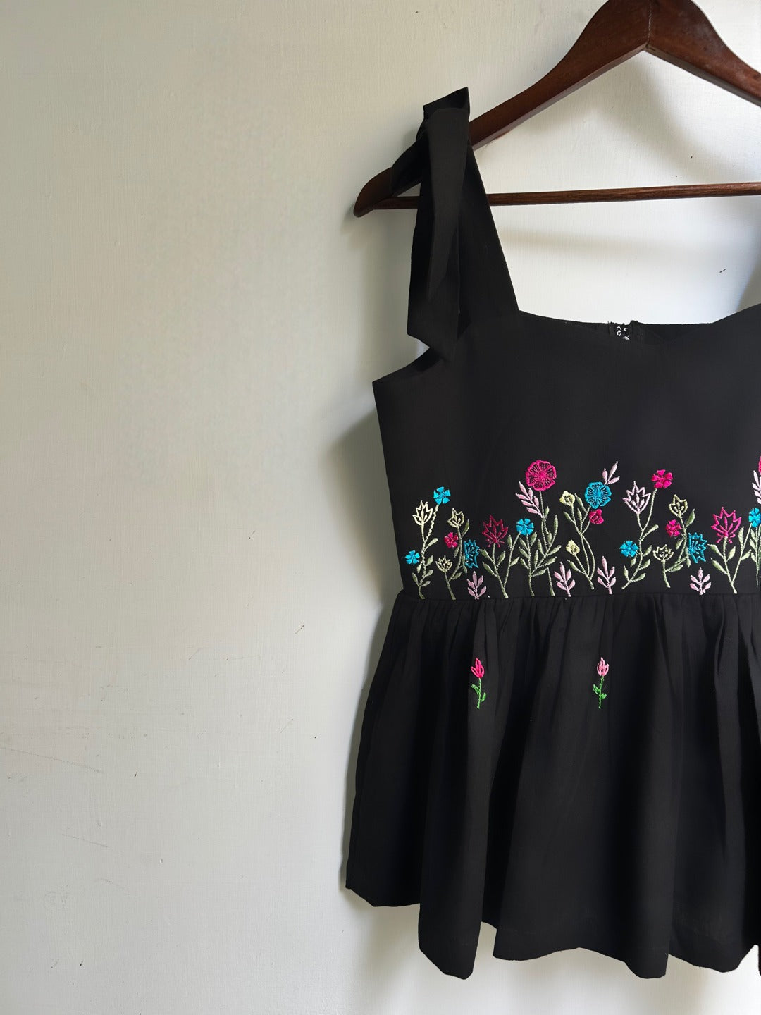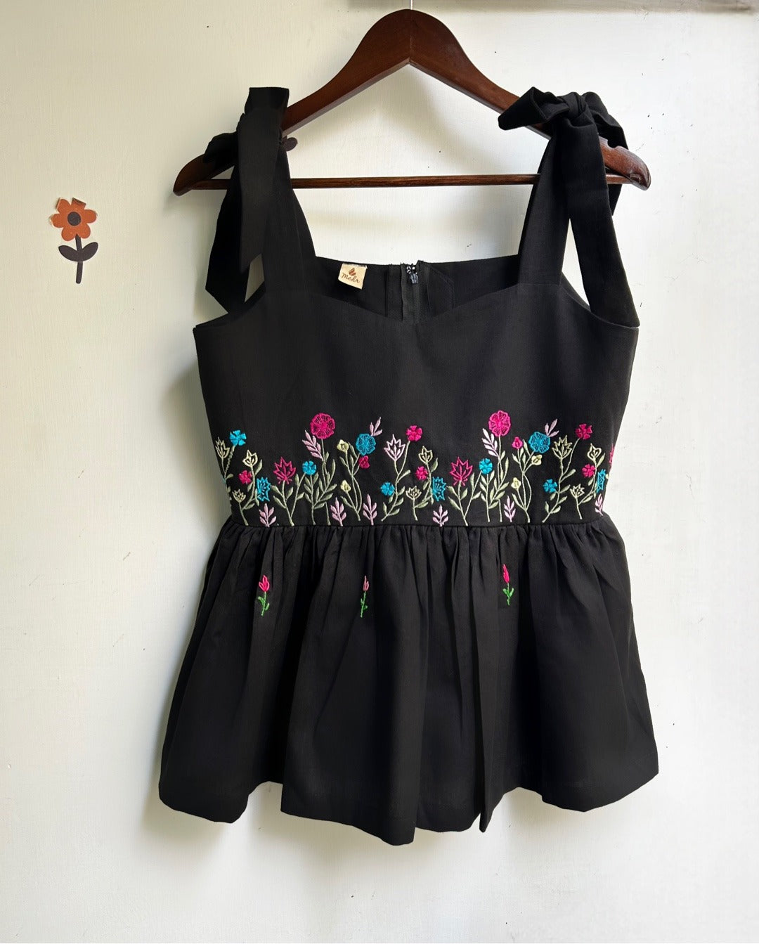 The top features a flattering peplum silhouette that cinches at the waist and flares out beautifully, creating a feminine and sophisticated look. What truly makes this top special is the delicate and vibrant hand-embroidered floral border at the waist. "Embroidered with love," the colorful blossoms bring a touch of nature-inspired artistry to the classic black fabric.
