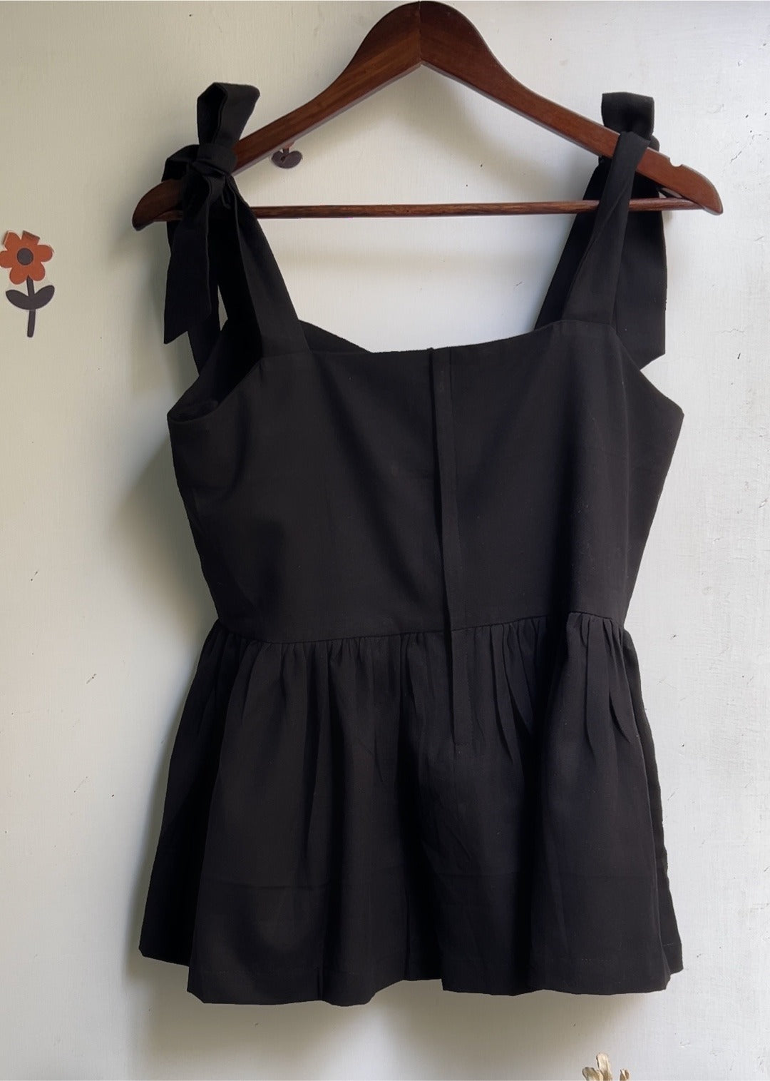 Step into a world of whimsical elegance with our Floral Peplum Top, a perfect blend of modern style and intricate craftsmanship. This stunning black top is made from high-quality linen, offering a lightweight and breathable feel that is perfect for warmer days.