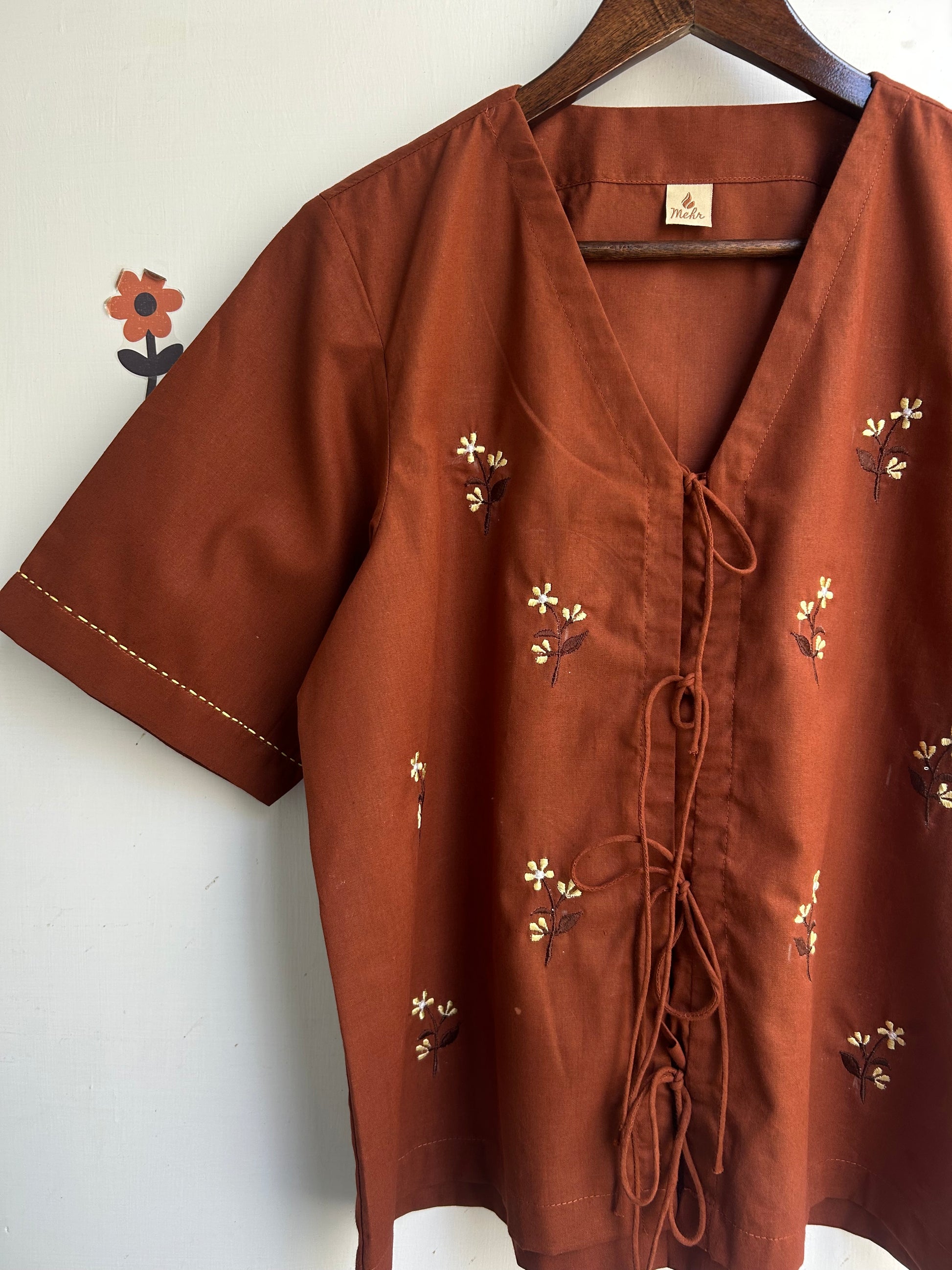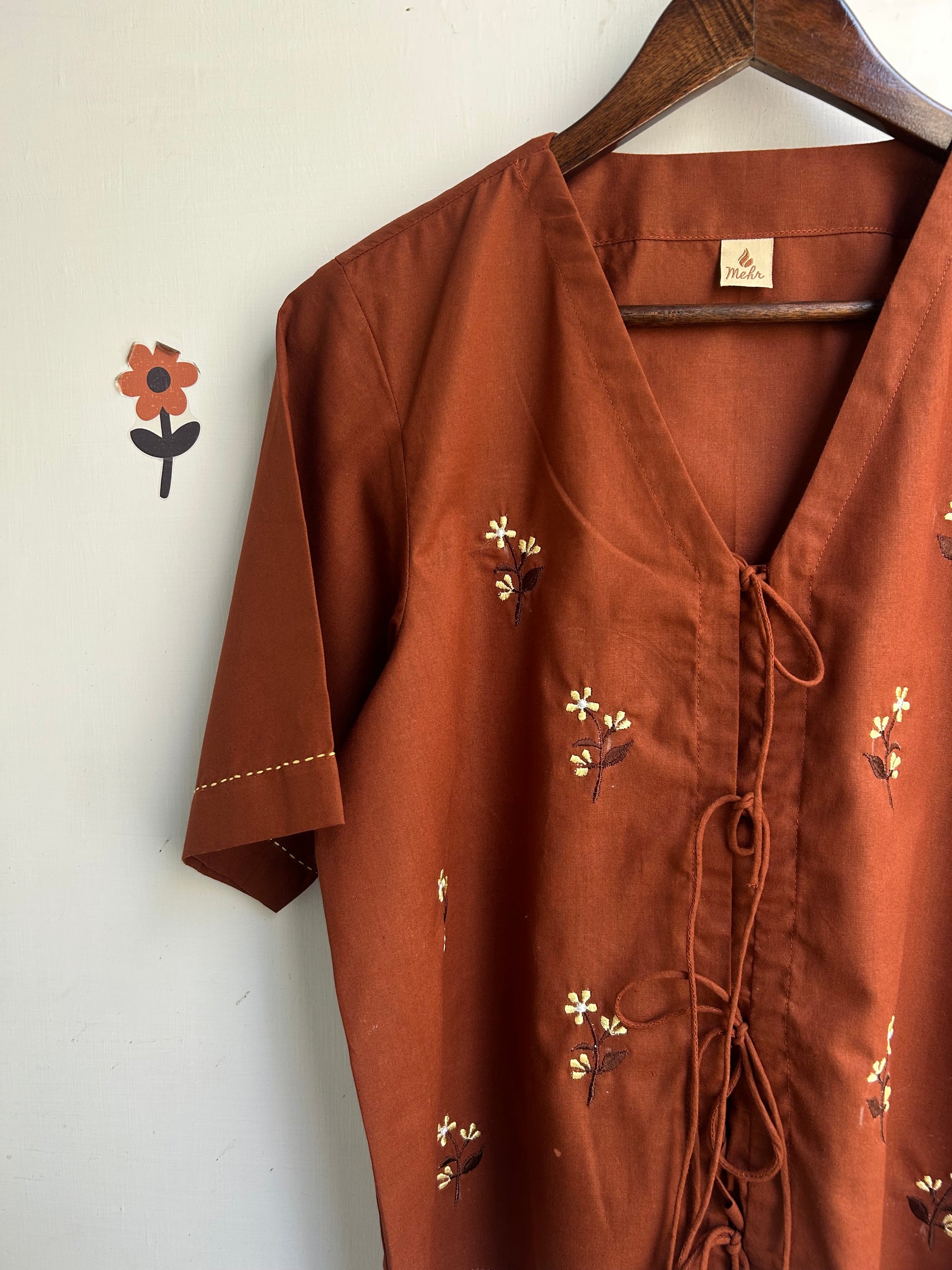 A warm rust-toned beauty, the Sunheri Knot Top is detailed with delicate hand-embroidered yellow florals that add charm and character. Designed with a flattering V-neckline and tie-up knots along the front, it blends traditional craftsmanship with modern ease. The relaxed sleeves and breathable cotton fabric make it a versatile piece you can wear from day to night—pair it with denims, skirts, or trousers for an effortlessly chic look.