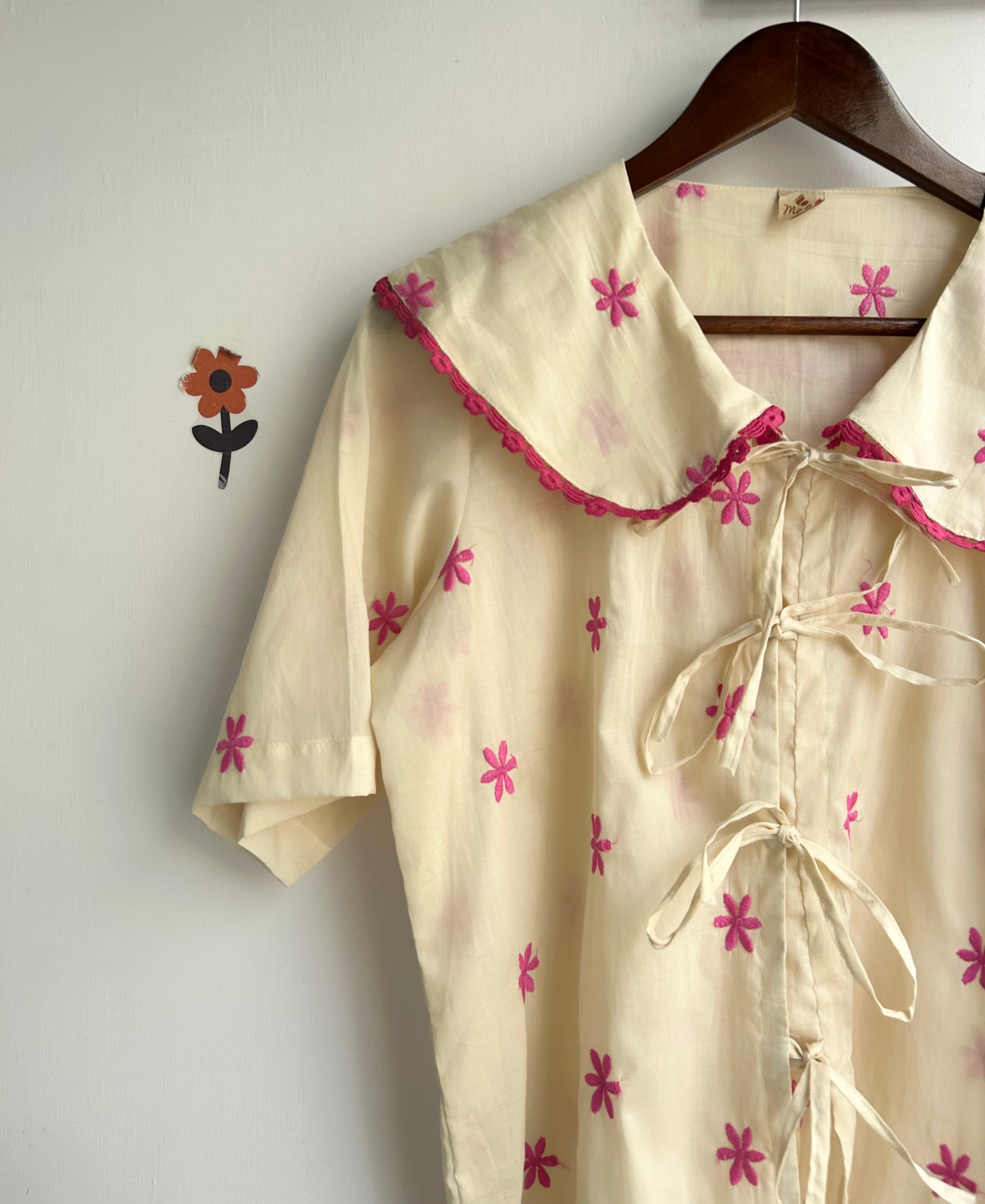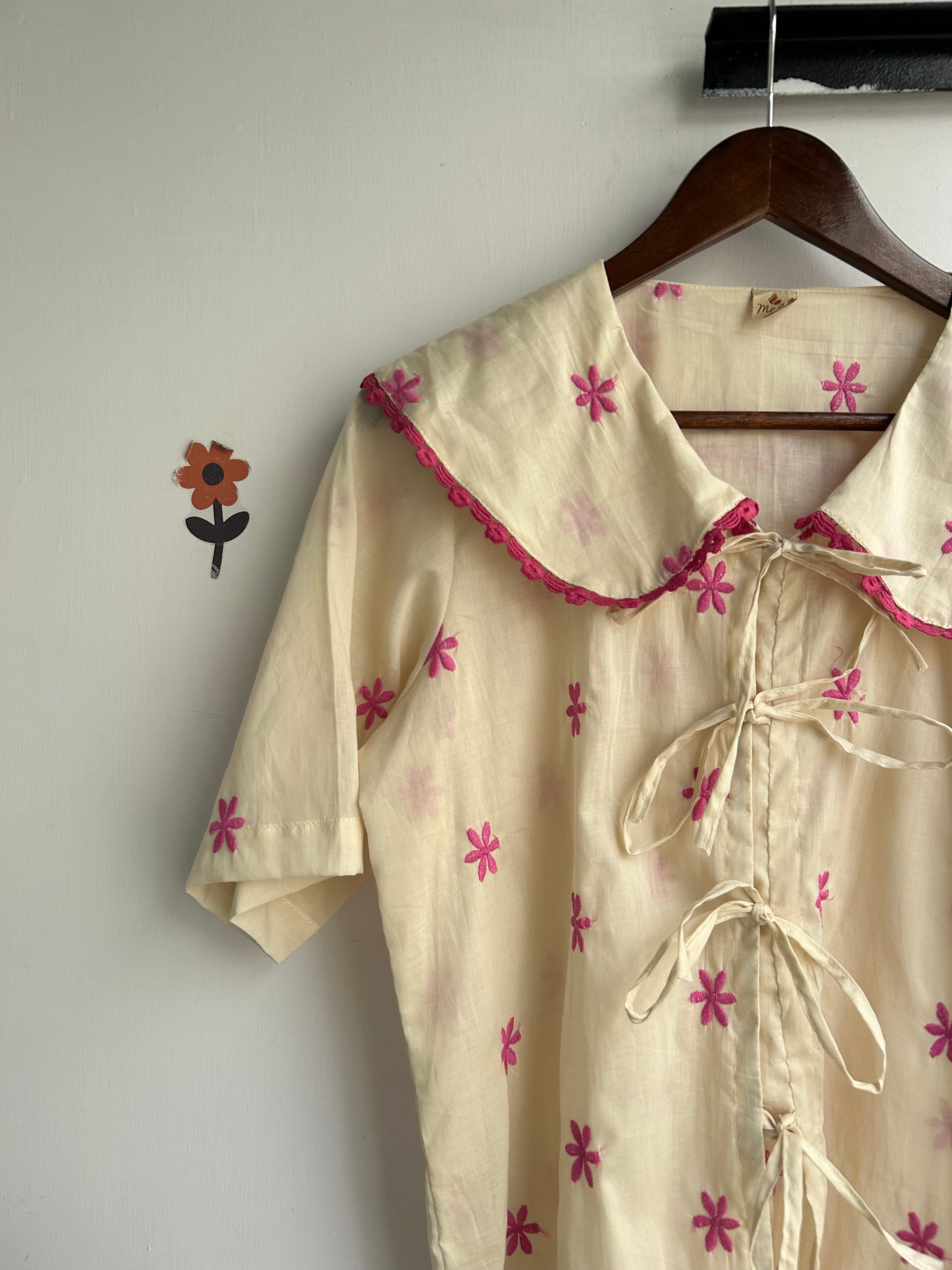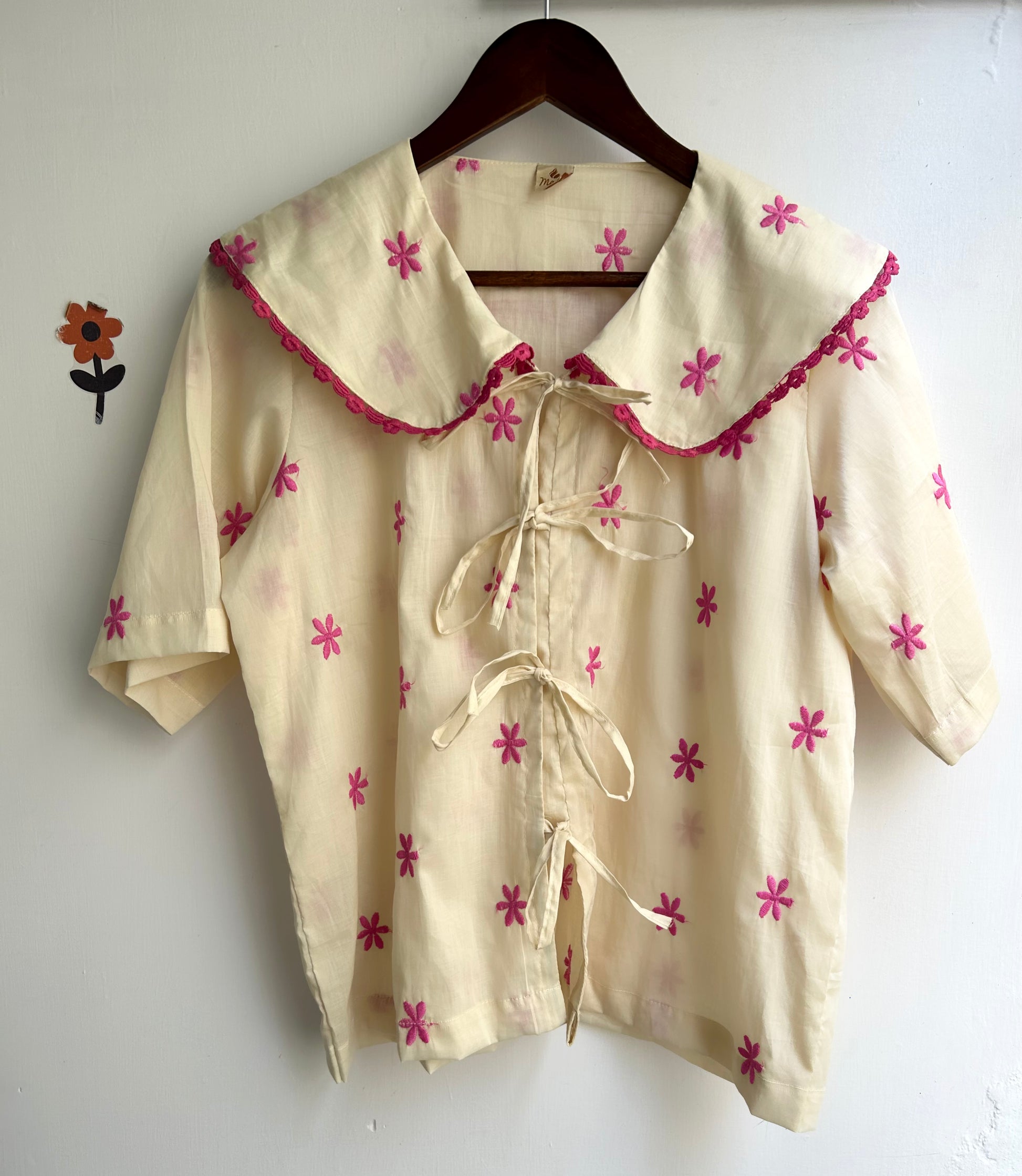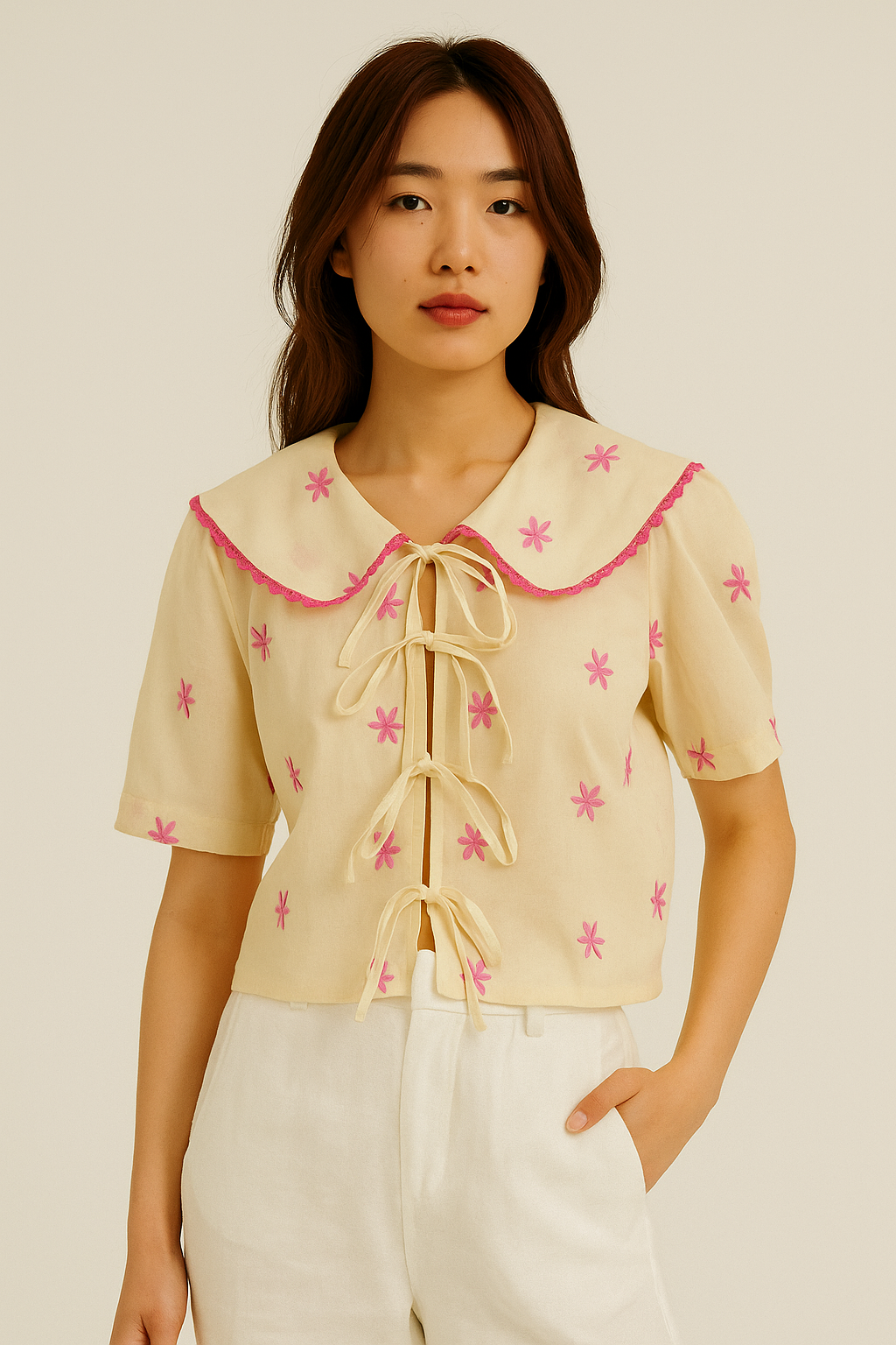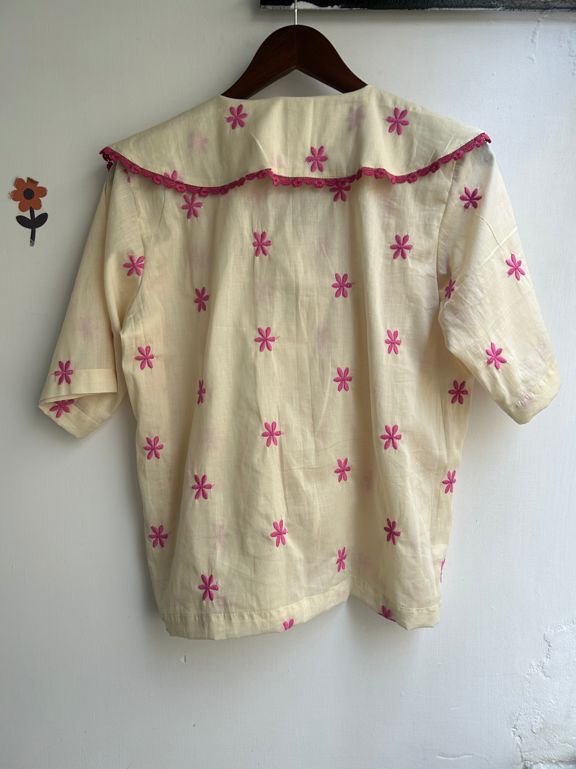 The Pink kiara Top is a playful blend of charm and comfort, featuring delicate pink floral embroidery on a soft beige base. Designed with a statement scalloped collar, dainty tie-up front, and short sleeves, this handcrafted piece brings a fresh, feminine touch to your everyday wardrobe. Perfect for brunch dates, vacations, or casual outings, it pairs beautifully with trousers, skirts, or denim for a chic, effortless look.